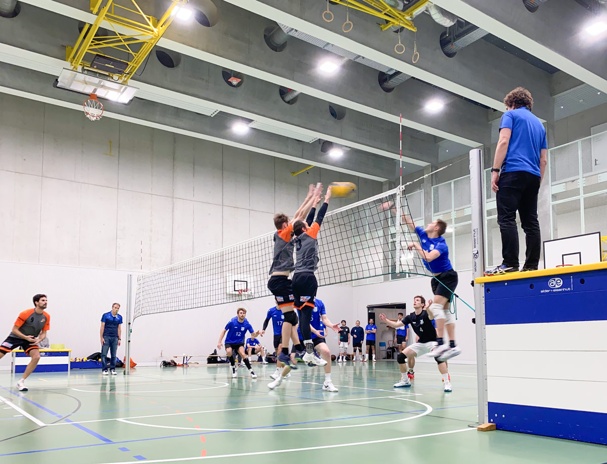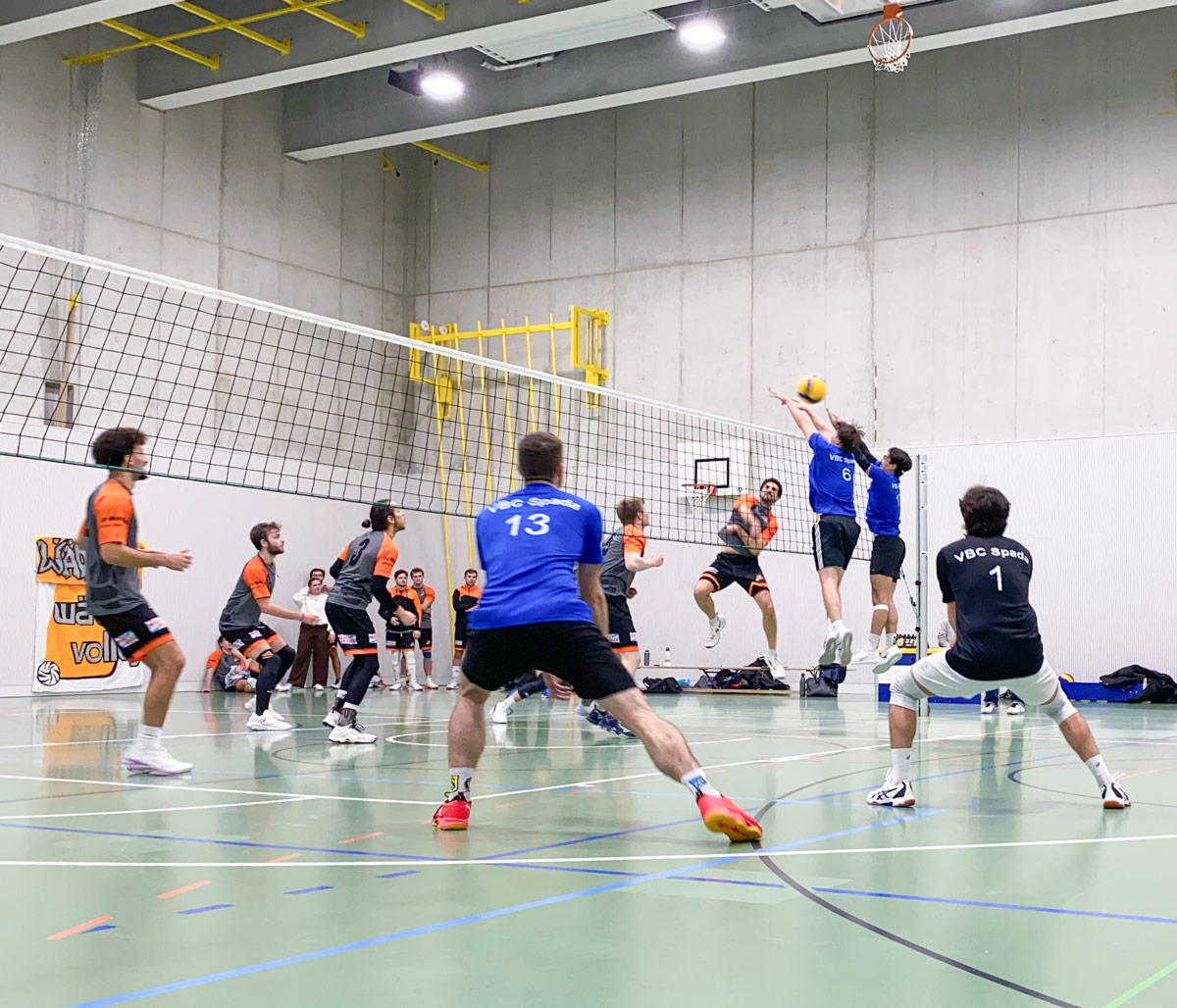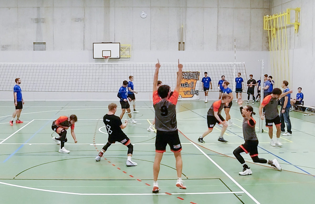 Auch Wädis Punkt zum Satzsieg endete mit einem geblockten Ball, der Spadas Libero noch am Kopf traf, aber dann nicht mehr spielbar war. Wädi jubelte, Spadas Herren ärgerten sich.